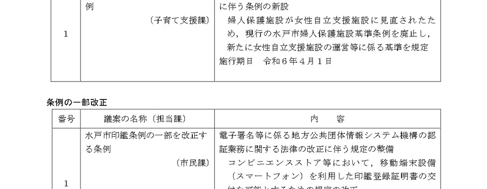 今定例会では、内原駅北側自由通路整備工事や水戸市職員の給与に関する条例等の一部を改正する条例のほか、市道路線の認定及び廃止などの議案22件、専決処分について(和解及び損害賠償の額を定めることについて)の報告11件が提案されました。